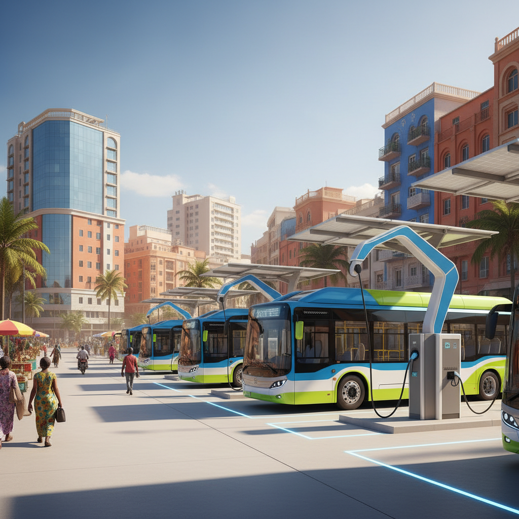 Comprehensive electric bus network integrated with smart city infrastructure and renewable energy.